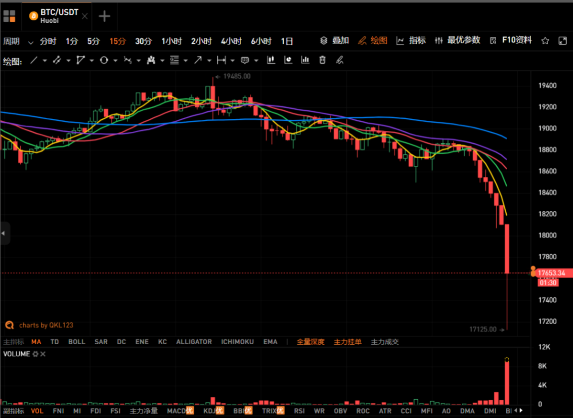 Muy cerca, repentinamente se derrumbó. A las 11:30 am del 26 de noviembre, Bitcoin se desplomó repentinamente, cayendo desde el punto más bajo de 18913 a 17125.