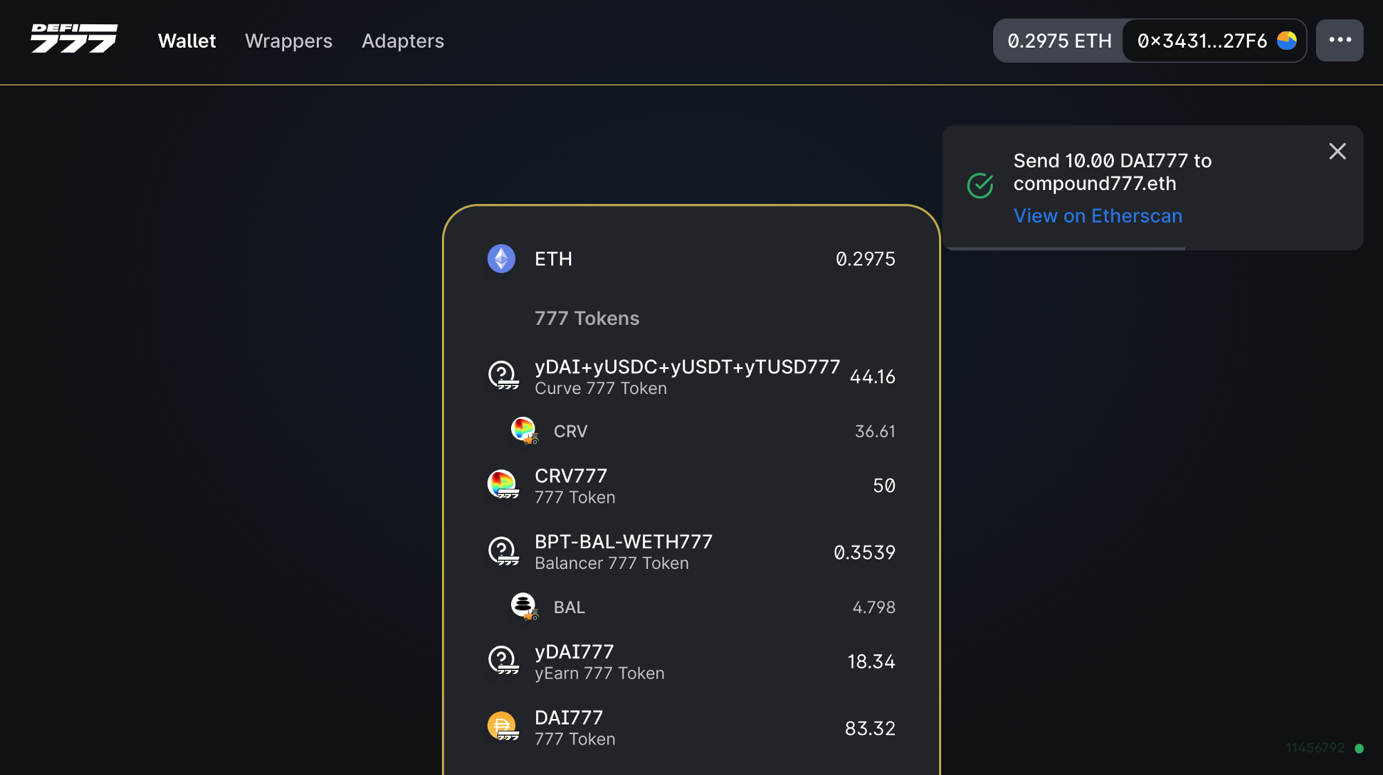La función más poderosa de DeFi777 es apoyar la agricultura de rendimiento. Depositar fondos en un grupo Balancer o Curve da como resultado un token especial de "granjero", que representa tanto el LP subyacente como cualquier ganancia acumulada (BAL o CRV).