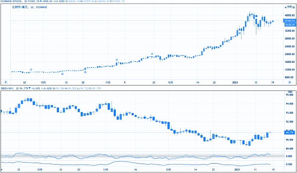 1. El precio de BTC está negativamente correlacionado con el índice del dólar estadounidense