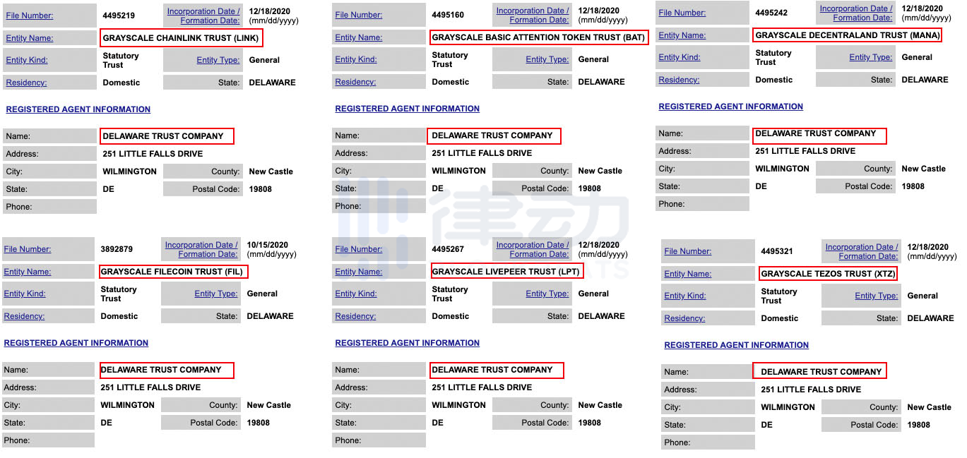 Después de consultar el sitio web oficial del gobierno del estado de Delaware, hay entidades fiduciarias sospechosas de estar relacionadas con Grayscale, a saber, "GRAYSCALE BASIC ATTENTION TOKEN TRUST (BAT)", "GRAYSCALE CHAINLINK TRUST (LINK)", "GRAYSCALE DECENTRALAND TRUST (MANA) ", "GRAYSCALE FILECOIN TRUST (FIL)", "GRAYSCALE LIVEPEER TRUST (LPT)", "GRAYSCALE TEZOS TRUST (XTZ)" seis entidades fiduciarias (Entidad).