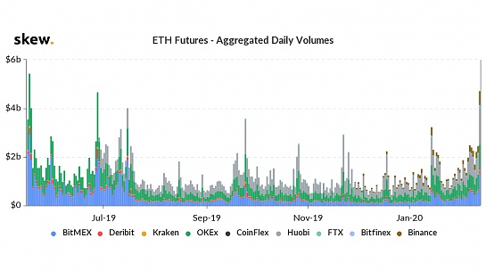Tres grandes bolsas, BitMEX, Huobi y OKEx, negociaron cada una más de $ 1 mil millones en futuros de éter el miércoles, lo que representa casi el 85 por ciento del volumen total de operaciones.